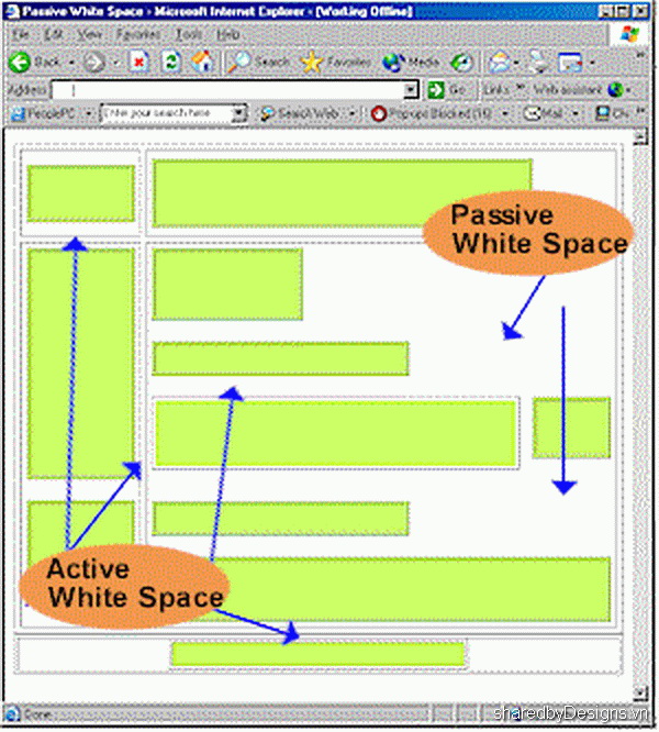 2. Khoảng trắng bị động (Passive White Space): Không gian trống xung quanh bên ngoài của trang, hoặc vùng trống của nội dung thiết kế xuất hiện trong quá trình dàn trang, nó không tham gia vào việc thể hiện ý đồ thiết kế.