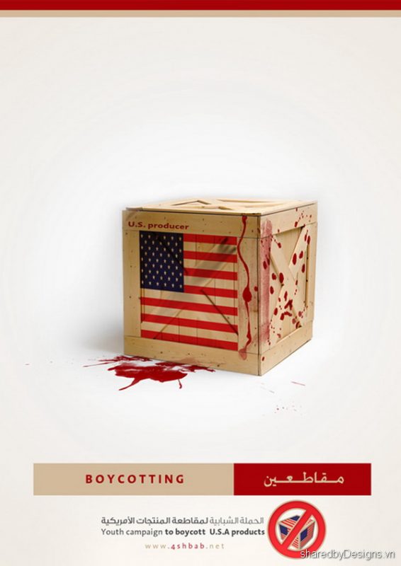Đây là một poster của một nhóm bạn trẻ thiết kế để tẩy chay các sản phẩm của Hoa Kỳ, nhưng mục đích của quảng cáo không quan trọng. Đây là một thiết kế có ý đồ rõ ràng. Với việc sử dụng một phông nền tối giản, nó thu hút tầm nhìn ngay cả những người ở khoảng cách khá xa.