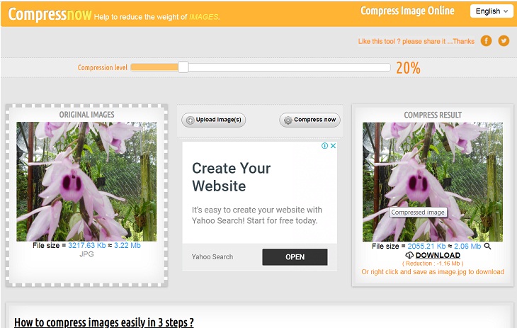 Ngay sau đó, bạn sẽ thấy dung lượng của hình ảnh gốc khi tải lên Compressnow. Tiếp theo chúng ta sẽ điều chỉnh thanh nén dung lượng bên trên. Tỉ lệ nén càng cao thì chất lượng ảnh càng giảm và ngược lại. Dịch vụ sẽ để mặc định là 20%. Khi bạn chỉnh đến tỉ lệ nén bao nhiêu thì sẽ kèm với dung lượng ảnh tương ứng.