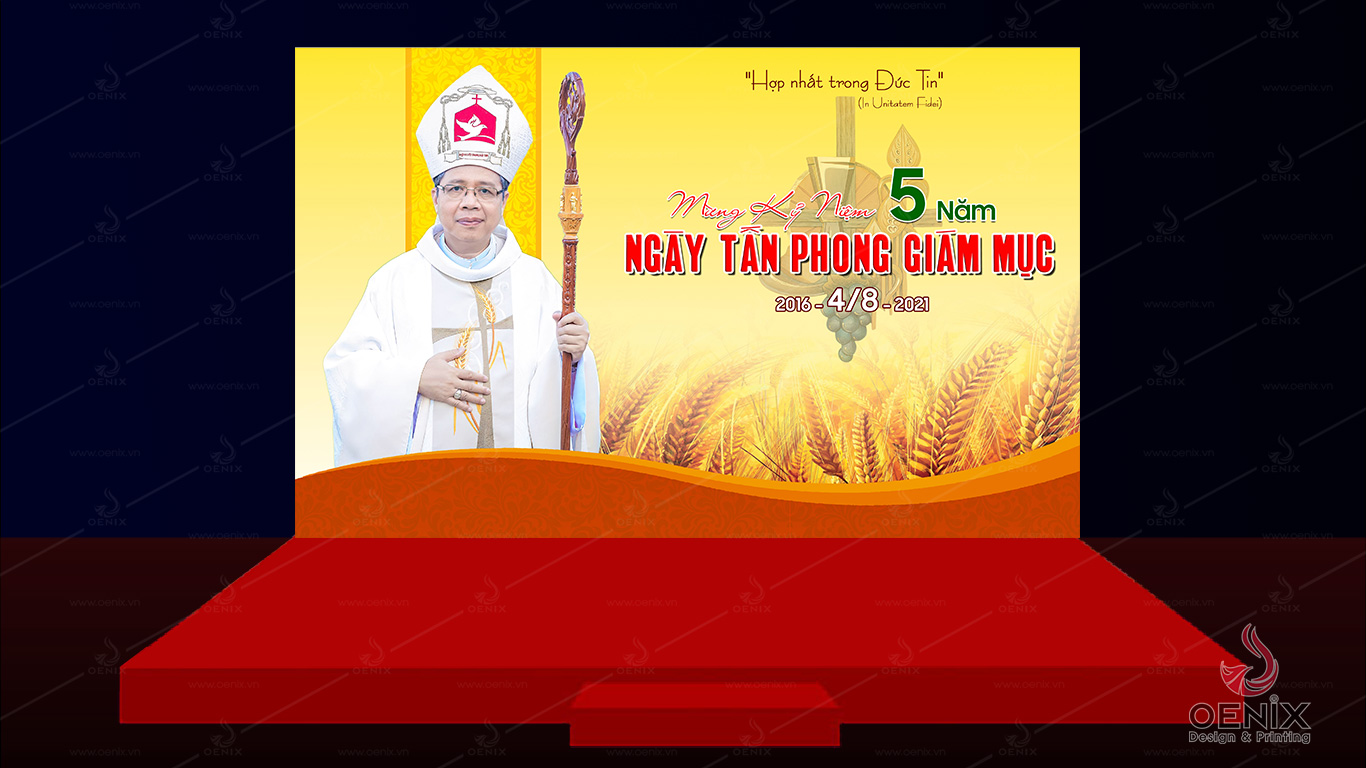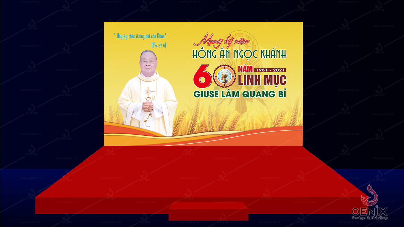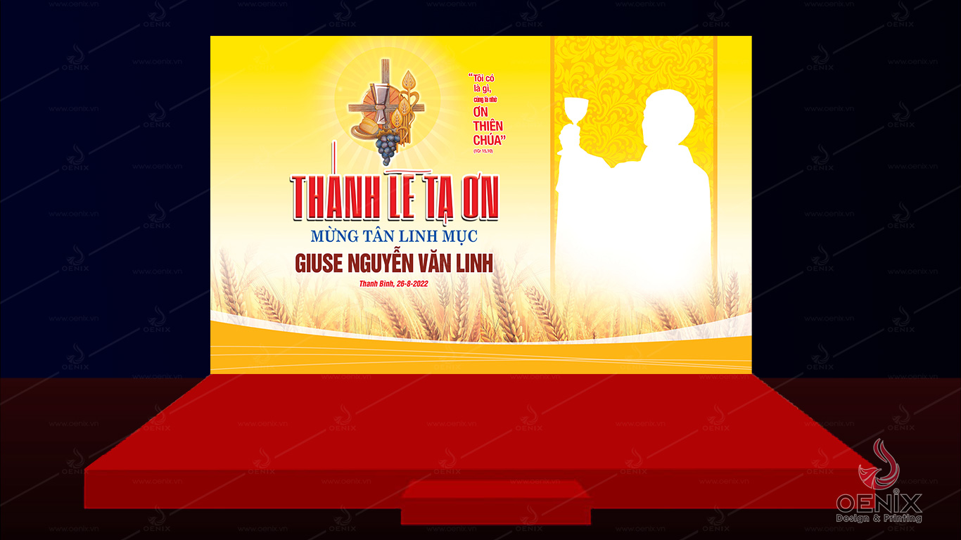 Theo kinh nghiệm cá nhân, backdrop lễ truyền chức linh mục hoặc lễ kỷ niệm phụ phong linh mục thường được thiết kế với tông màu vàng + xanh da trời.