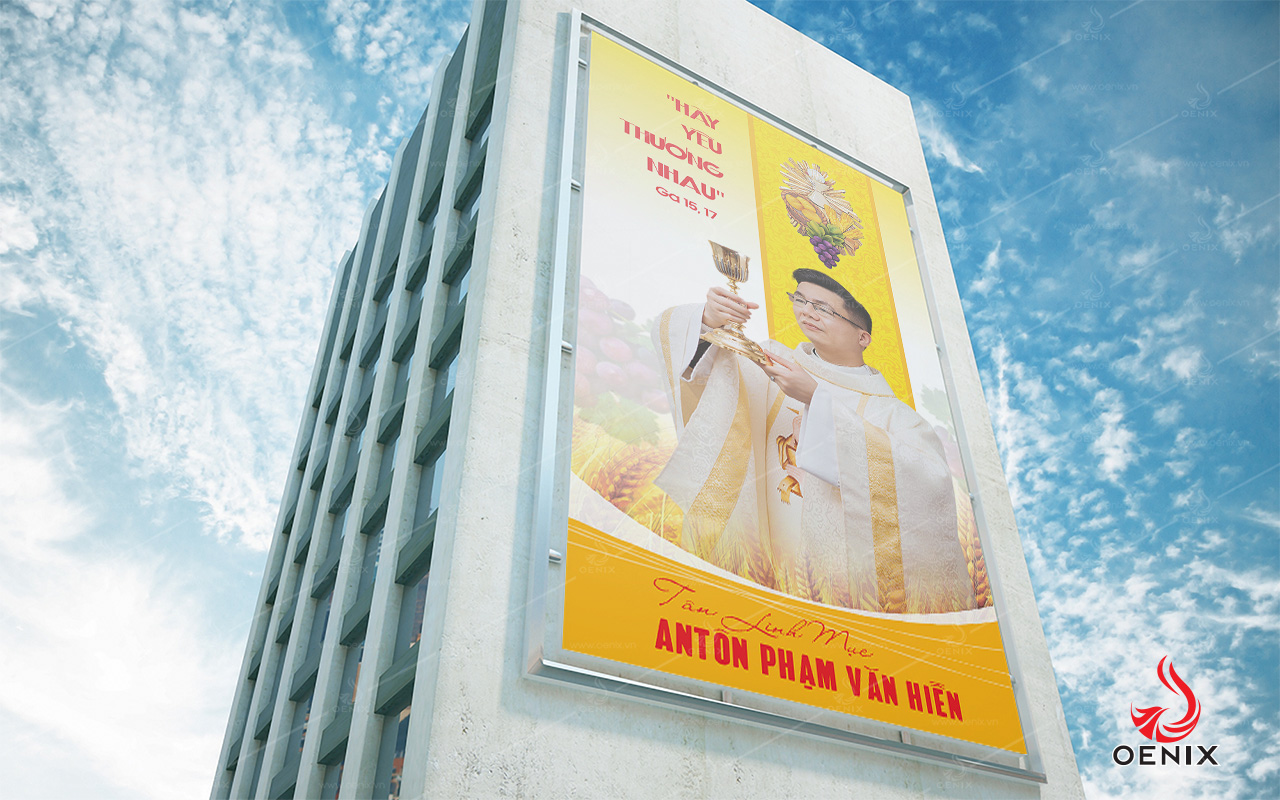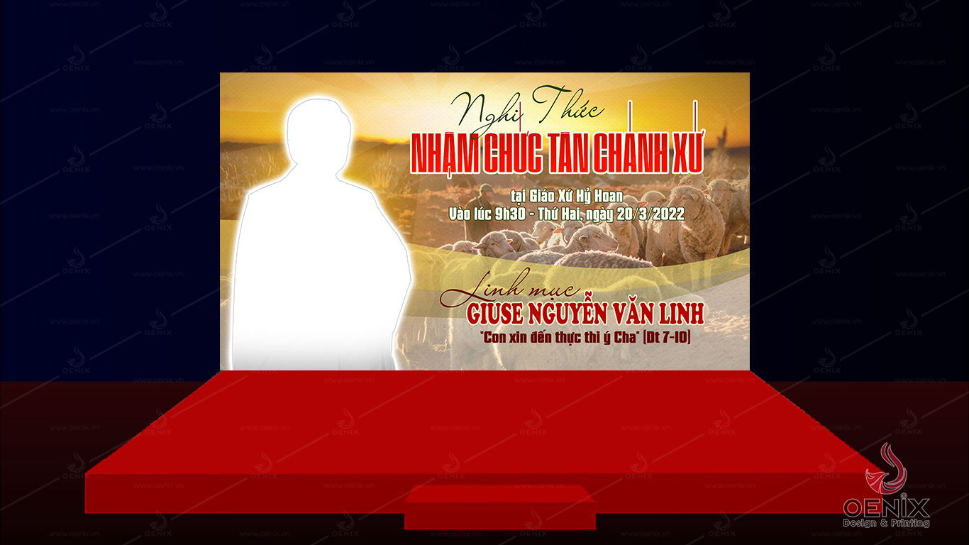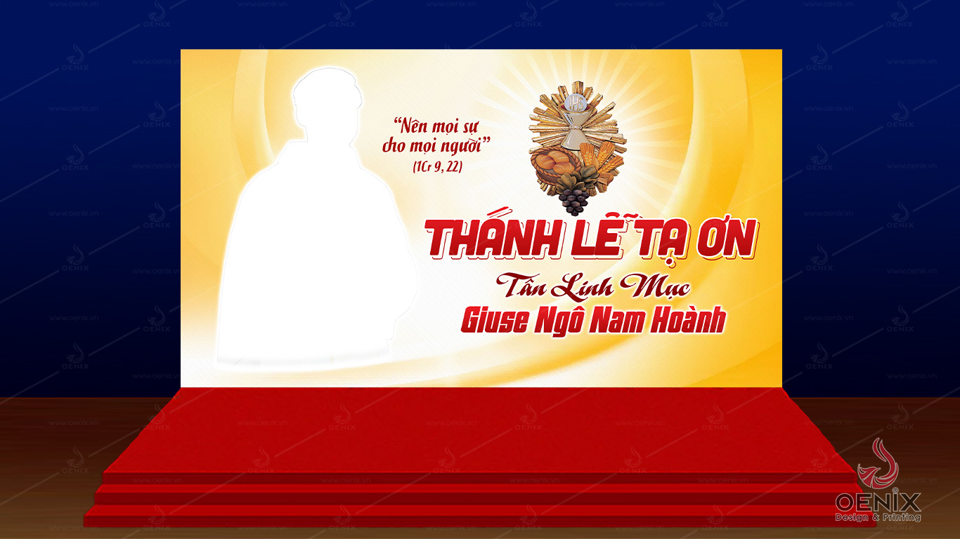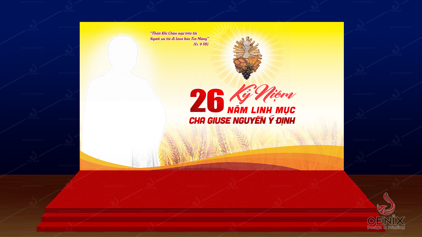 Theo kinh nghiệm cá nhân, backdrop lễ truyền chức linh mục hoặc lễ kỷ niệm phụ phong linh mục thường được thiết kế với tông màu vàng + xanh da trời.